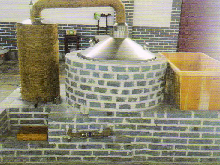 用傳統釀酒設備釀酒技術為:質料→浸泡→初蒸→燜糧→復蒸→出甑攤涼→加曲→裝桶培菌→加水平配糟→裝桶發酵→蒸餾→成品酒。
